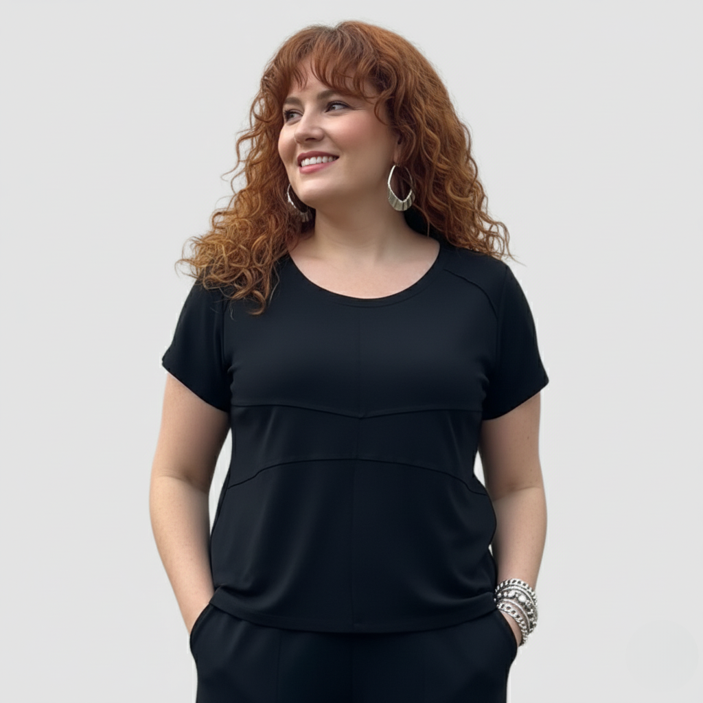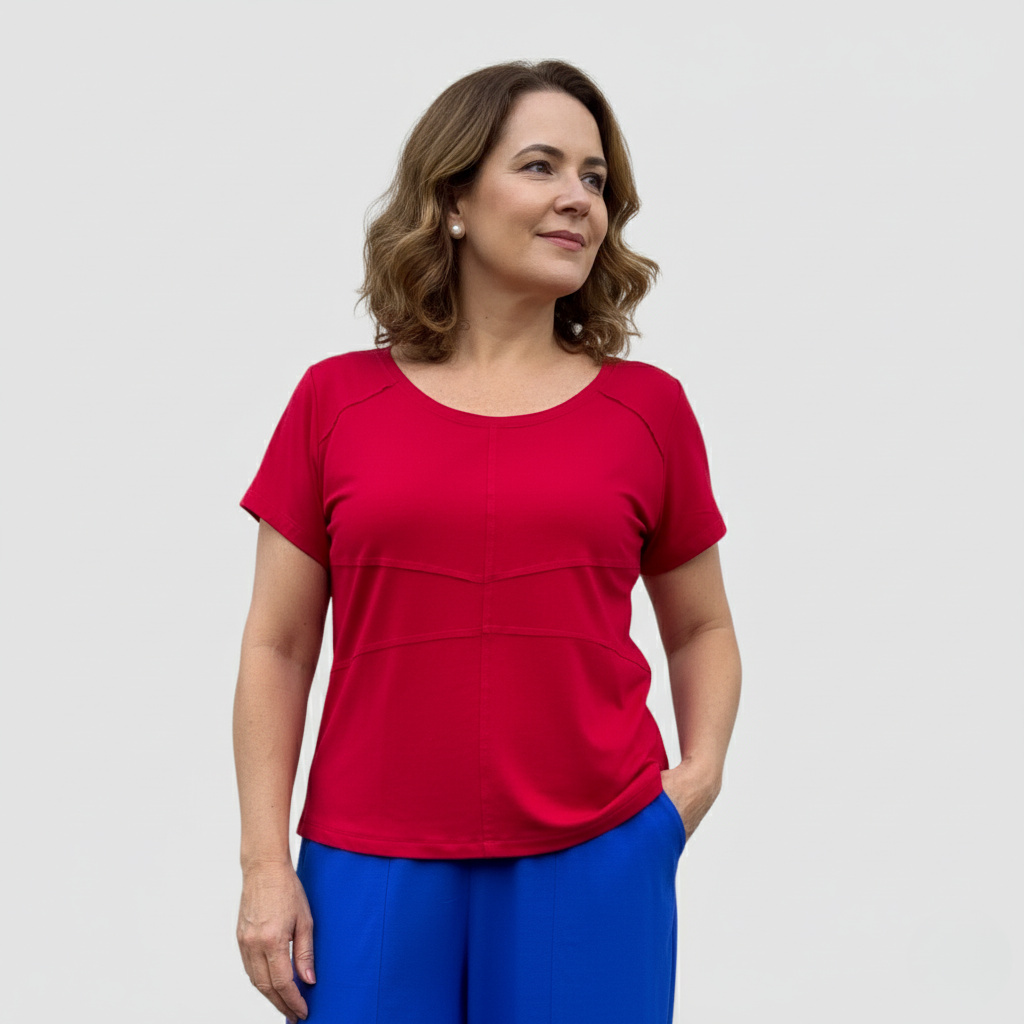 A Baby Look Paula é confeccionada em tecido viscolycra de alta gramatura, composto por 96% viscose e 4% elastano, garantindo conforto e durabilidade. Seu design apresenta manga curta e decote em U frontal, ideal para diversas ocasiões. A frente com costuras recortadas adiciona um toque moderno e sofisticado à peça. Perfeita para quem busca estilo aliado à praticidade no dia a dia.