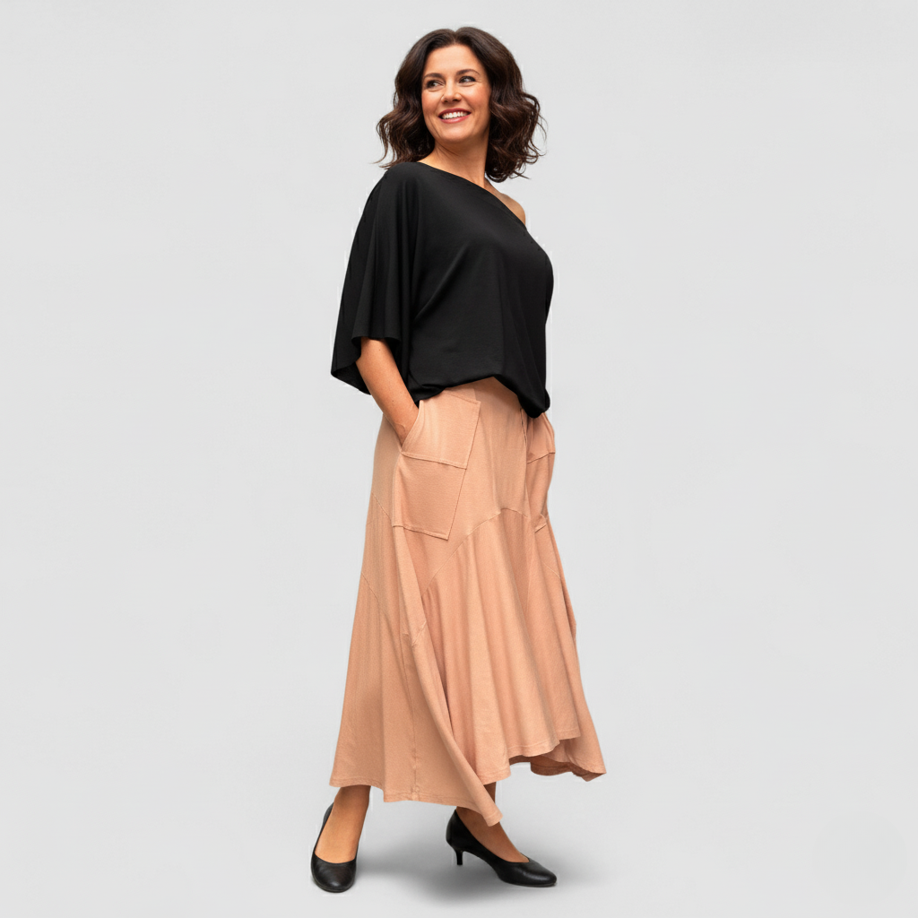 A Saia Bárbara é confeccionada em viscolycra de alta gramatura, combinando 96% viscose e 4% elastano, garantindo conforto e durabilidade. Seu design assimétrico traz modernidade, enquanto o cós com elástico oferece ajuste perfeito. Prática, conta com bolsos laterais para maior funcionalidade. Ideal para compor looks elegantes e versáteis no seu dia a dia.